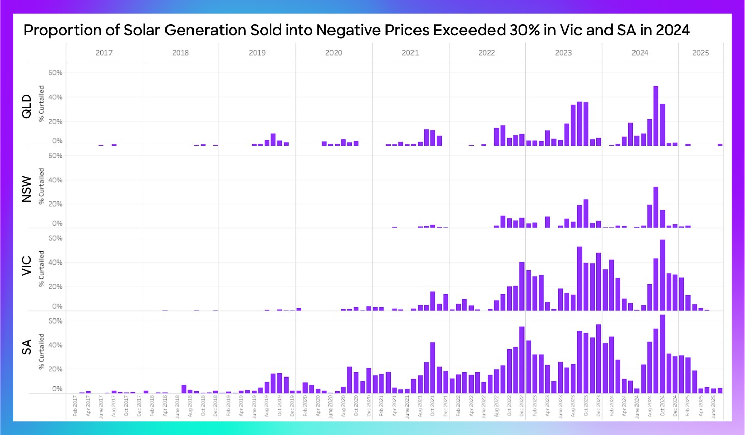 In fact, in 2024 over 30% of all generation from Victoria and South Australia occurred when wholesale prices were negative, with October 2024 hitting over 60%.