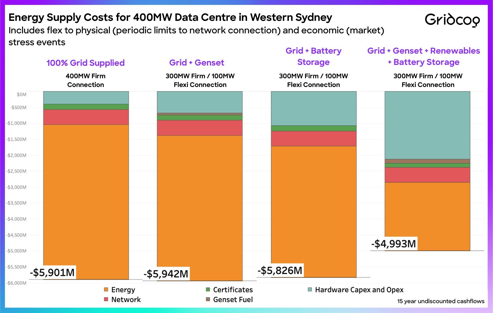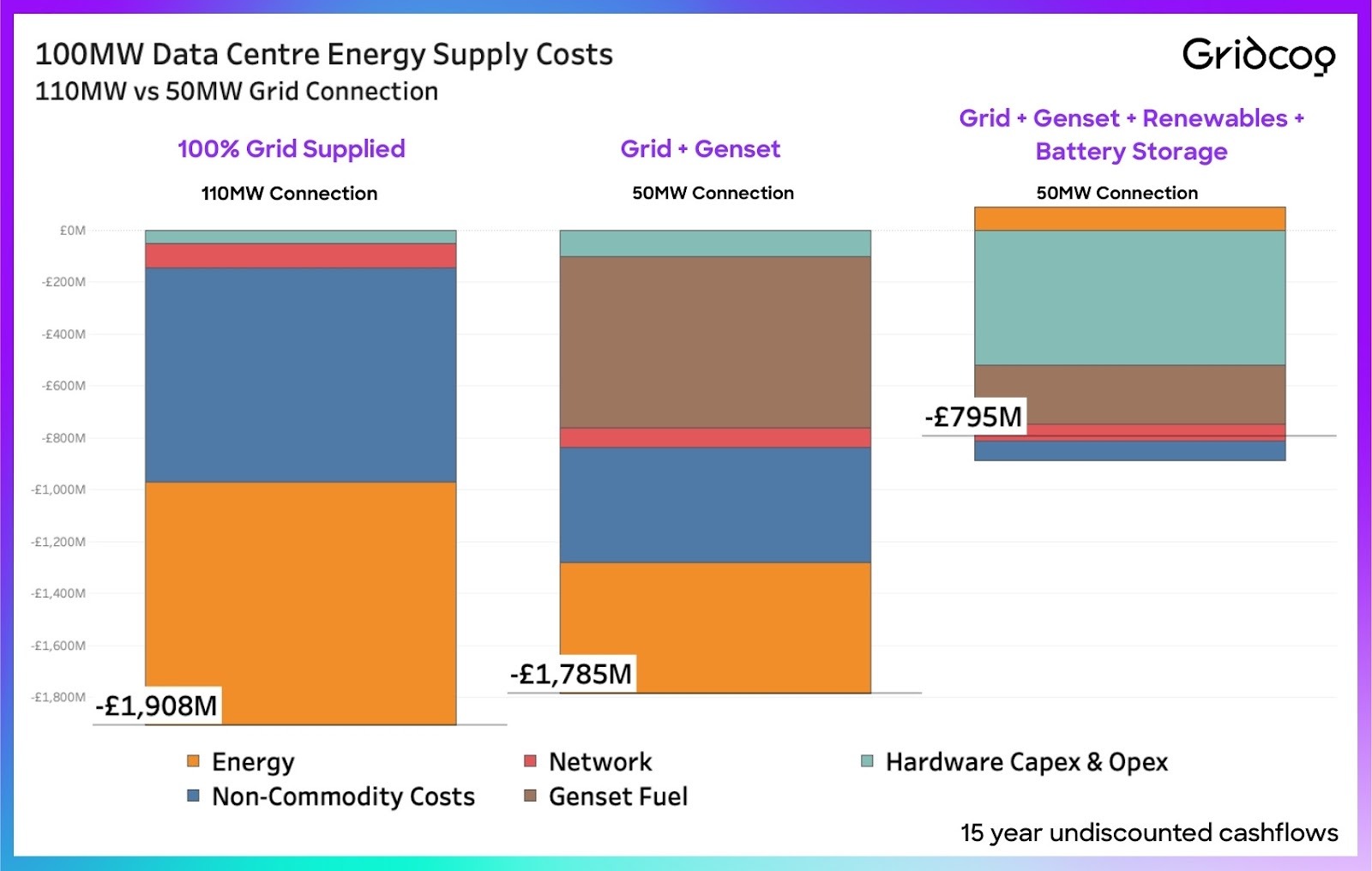A fully grid-supplied approach, modelled at £1.9 billion over 15 years, is operationally straightforward but often difficult in practice.