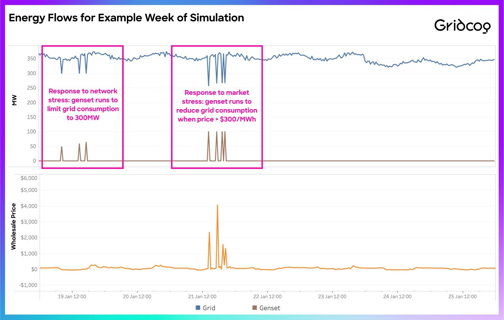 The attached graphics provide a comparison of energy supply costs for each scenario over 15 years, and a zoom-in on the energy flows for a single week of the simulation where flex is required for both physical and economic reasons. I've focussed on the genset scenario simply as it makes for a cleaner graphic.